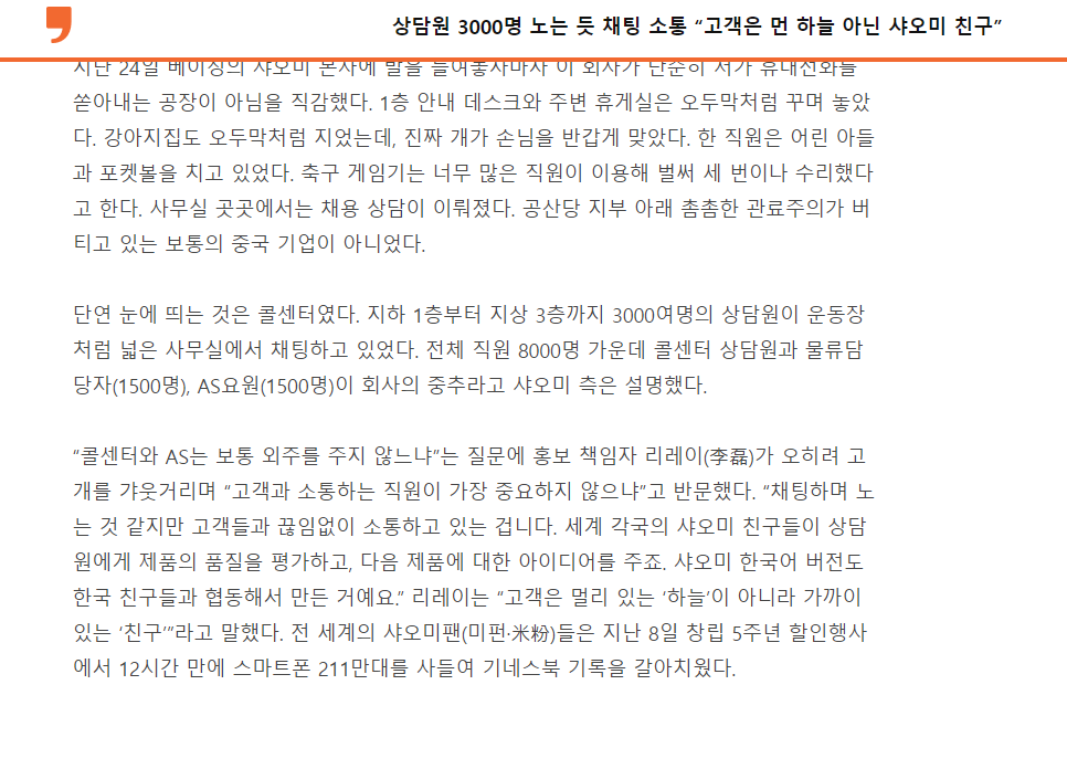 샤오미 또한 고객들의 피드백으로 약점들을 지속적으로 개선하며, 이를 SNS를 통해 소통해 많은 충성 고객들을 확보하며 사업을 고도화시켰다.
